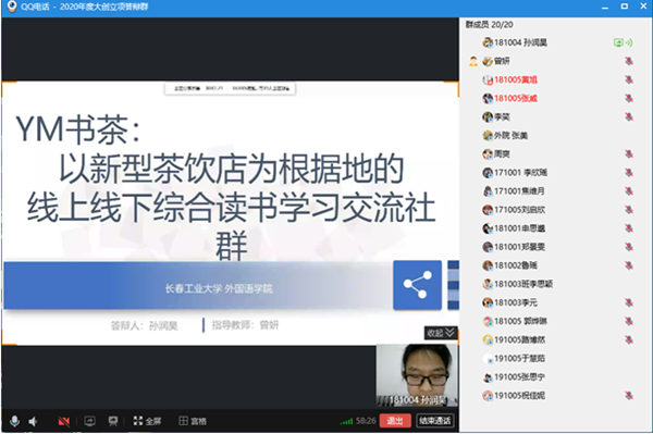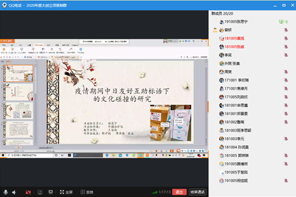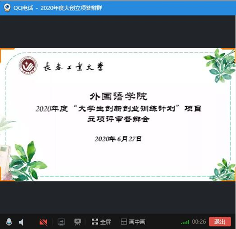 通过QQ屏幕共享在线进行了2020年度“大学生创新创业训练计划”项目的立项答辩工作。教学院长周爽出席答辩会,日语系主任曾妍、英语系书记李笑、俄语系主任张美担任此次立项答辩的专家评委。