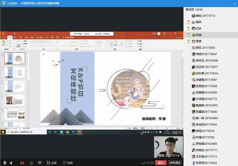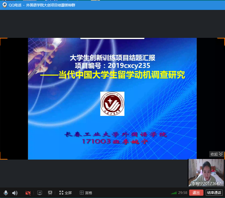 利用QQ网络平台进行了2019年度“大学生创新创业训练计划”项目结题线上验收评审工作。英语系主任刘宇、日语系主任曾妍、俄语系主任张美担任此次结题验收答辩的专家评委。学院副院长周爽全程参加评审验收。