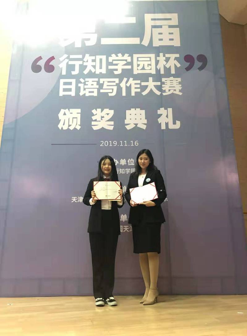 2017级日语专业学生李雨晴荣获“专业组二等奖”的优异成绩,其指导教师渡部惠老师荣获“优秀指导教师奖”。11月16日上午10点,李雨晴同学与渡部惠老师赴天津外国语大学参加了颁奖典礼。