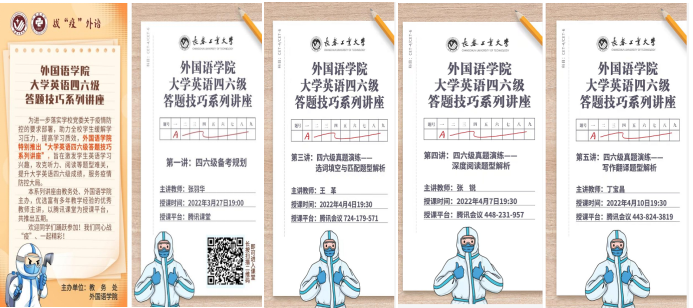 在学校教务处的指导和支持下,结合大学生备考英语四、六级考试的实际需求,于3月27日至4月10日,精心组织开展了战“疫”外语之“大学英语四、六级答题技巧系列讲座”,推出了五期精品辅导课程。部分讲座得到了吉林省教育厅的关注和认可,并通过我省高校教师教学发展联盟平台向全省高校推广,在线学习人数达6000余人,获赞6万余次,受到学界同仁和广大学子一致好评。