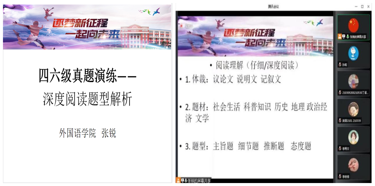 部分青年教师也对讲座进行了观摩学习,促进了业务交流和教学反思。公共外语教学部赵雪老师表示,本次系列讲座不仅是特殊时期备考学生的“定心丸”,也为青年教师提供了精品课观摩和向“大咖”们取经的机会。像学生一样听课,除了获得教法的点拨,更深刻体会到了前辈们对教学的深耕和分享的热忱。作为青年教师更要精进业务,提升教学本领,服务人才培养和战“疫”大局。公共外语教学部班明霞老师表示,作为一名青年教师,切身感到此次系列讲座内容实用性佳、针对性强、涵盖面广,有效地助力了全校学生缓解学习压力、提高学习质效、提升大学英语四六级成绩,自身也受益匪浅。要主动参与疫情特殊时期的教育教学工作,坚决保证教学质量和效果,与校、院和广大同学同心战“疫”。