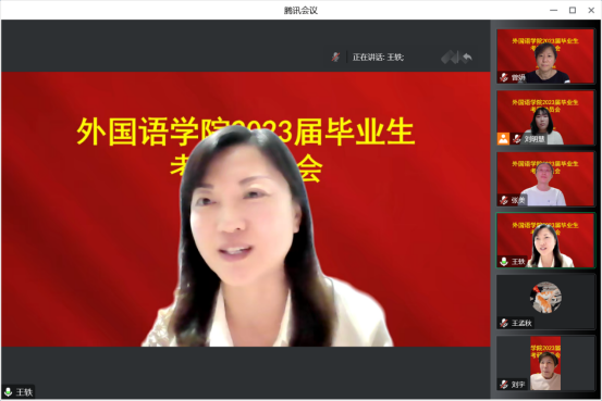 院长王轶、副院长曾妍、英语系主任刘宇、俄语系主任张美及全体2023届毕业生参加会议。会议由2023届毕业班辅导员刘明慧主持。