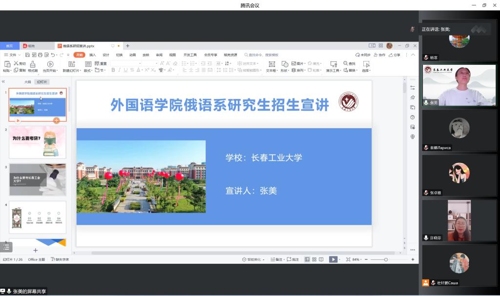 英语系主任毕晨慧、日语系主任崔伟和俄语系主任许晓菲分别主持三个专业的线上会议,19、20、21级学生参加了本次宣讲会。