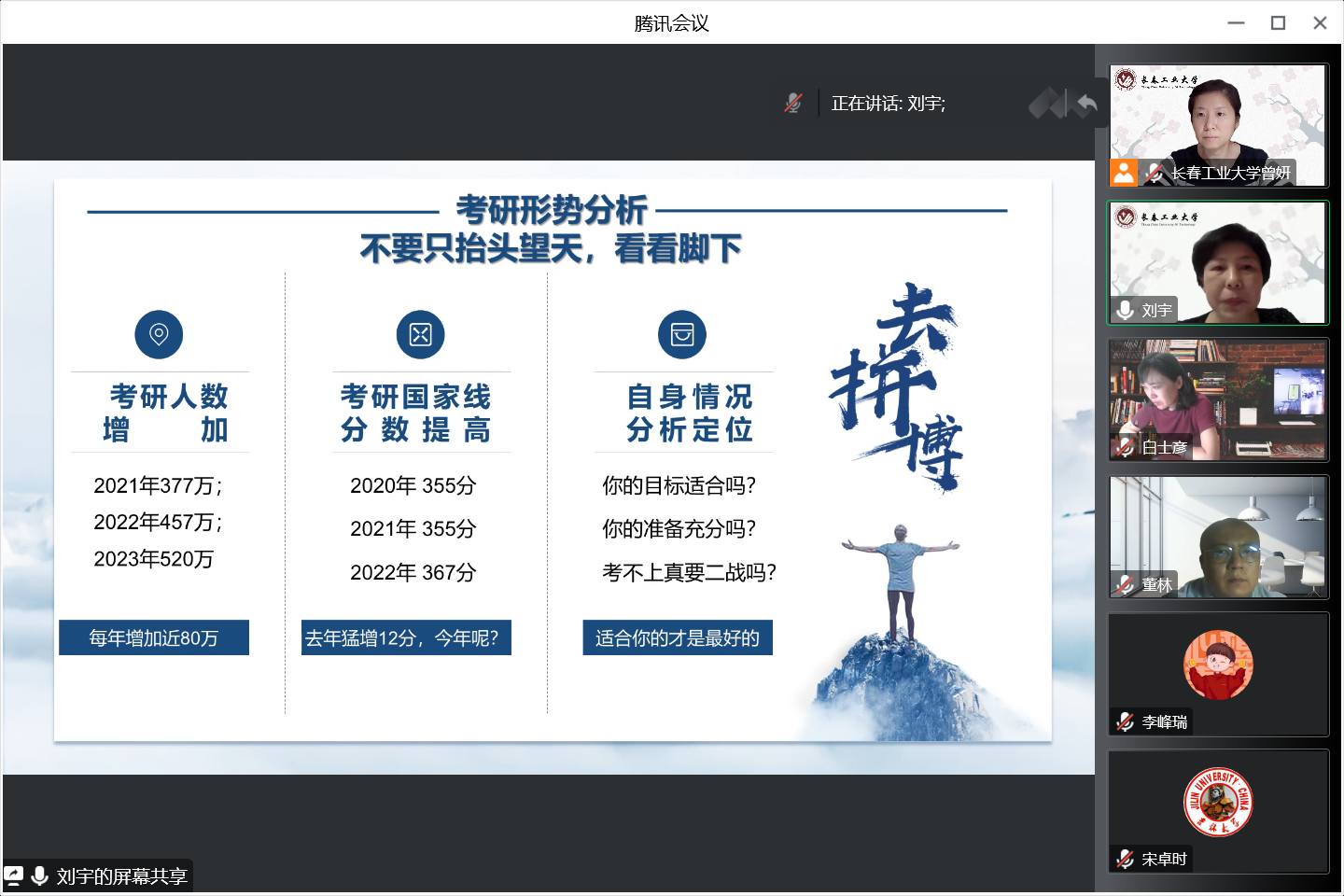 然后,刘宇介绍了外国语言学及应用语言学和英语语言文学两个方向的历史沿革和硕导团队的构成情况;举例说明了我校研究生的毕业去向;着重对目前的考研形势进行了分析,提示同学们应从实际出发,确定合适的考研目标,并详细解读了今年两个方向的命题形式。