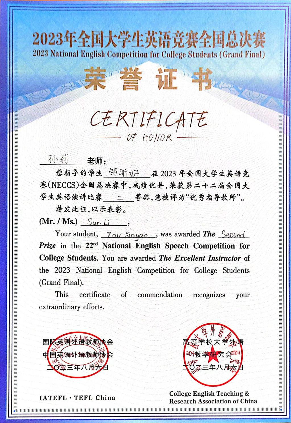 教师孙莉作为邹昕妍的指导教师在本次全国大学生英语竞赛中,荣获演讲比赛“优秀指导教师”、英语辩论赛“优秀指导教师”两项荣誉。