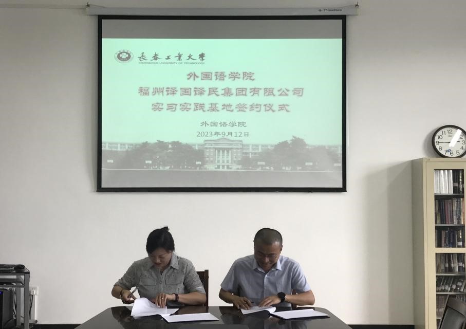 院长王轶与福州译国译民集团有限公司总经理林世宾签订翻译实习实践基地合作协议。会后,与会人员合影留念。