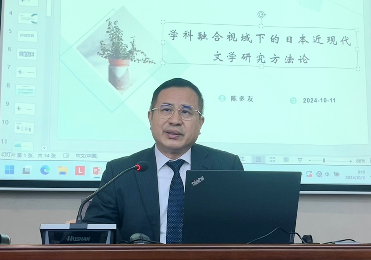 名师大讲堂系列讲座在北湖东区教学主楼435报告厅顺利举行。本次讲座在校科研处的大力支持下,特邀了广东外语外贸大学东方学研究院院长、教育部高等学校外国语言文学类教学指导委员会日语分委员会委员、中国日语教学研究会会长陈多友教授担任主讲嘉宾,主题为“学科融合视域下的日本文学研究方法论”。学院党委书记张子宇、院长王轶、副院长李秀文、部分日语专业教师和日本无码av