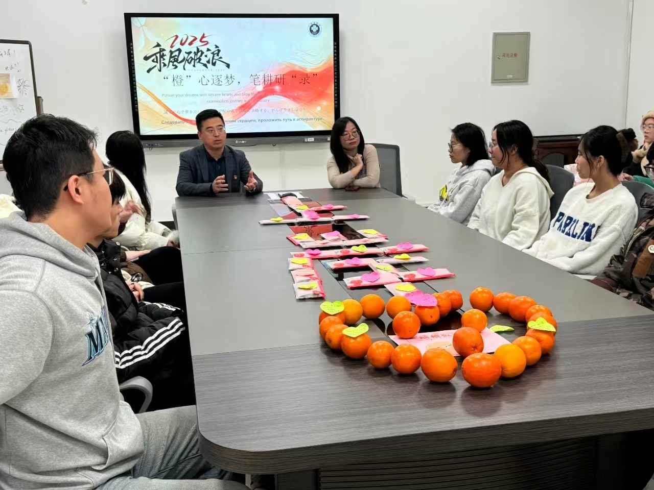 于12月12日上午在433会议室举办“橙”心逐梦、笔耕研“录”活动。学院党委副书记刘凤利,党委专职组织员、毕业班辅导员谭密以及在校备考的考研学生参加了此次活动。