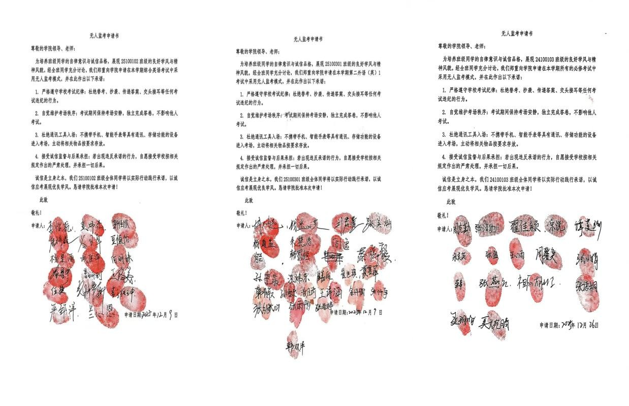 诚信考试的顺利推进,离不开考前的充分筹备。考试前一周,学院以班级为单位集中开展诚信考试主题教育活动。各班级通过专题班会形式,组织学生系统学习《学生手册》中关于考试纪律的相关规定,详细解读违纪作弊行为的处理办法,引导学生深刻认识诚信考试的重要意义,并集体签署《诚信考试承诺书》,以书面形式立下诚信应考誓言。此外,有意愿参与“无人监考”考试的班级,主动向学院递交了附有全班同学签字按手印的申请书,用实际行动践行自律承诺,彰显了外院学子的责任与担当。