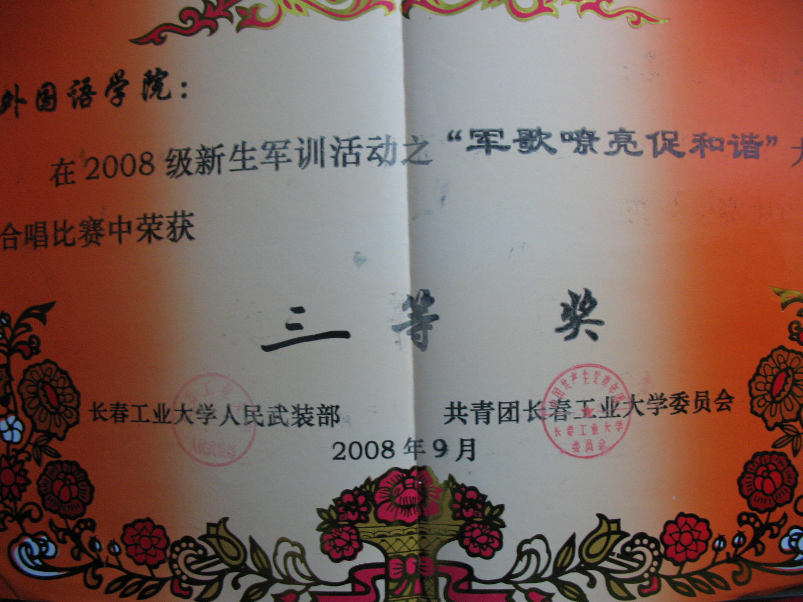 获得08级新生 军训活动之“军歌嘹亮促和谐”歌咏比赛三等奖。