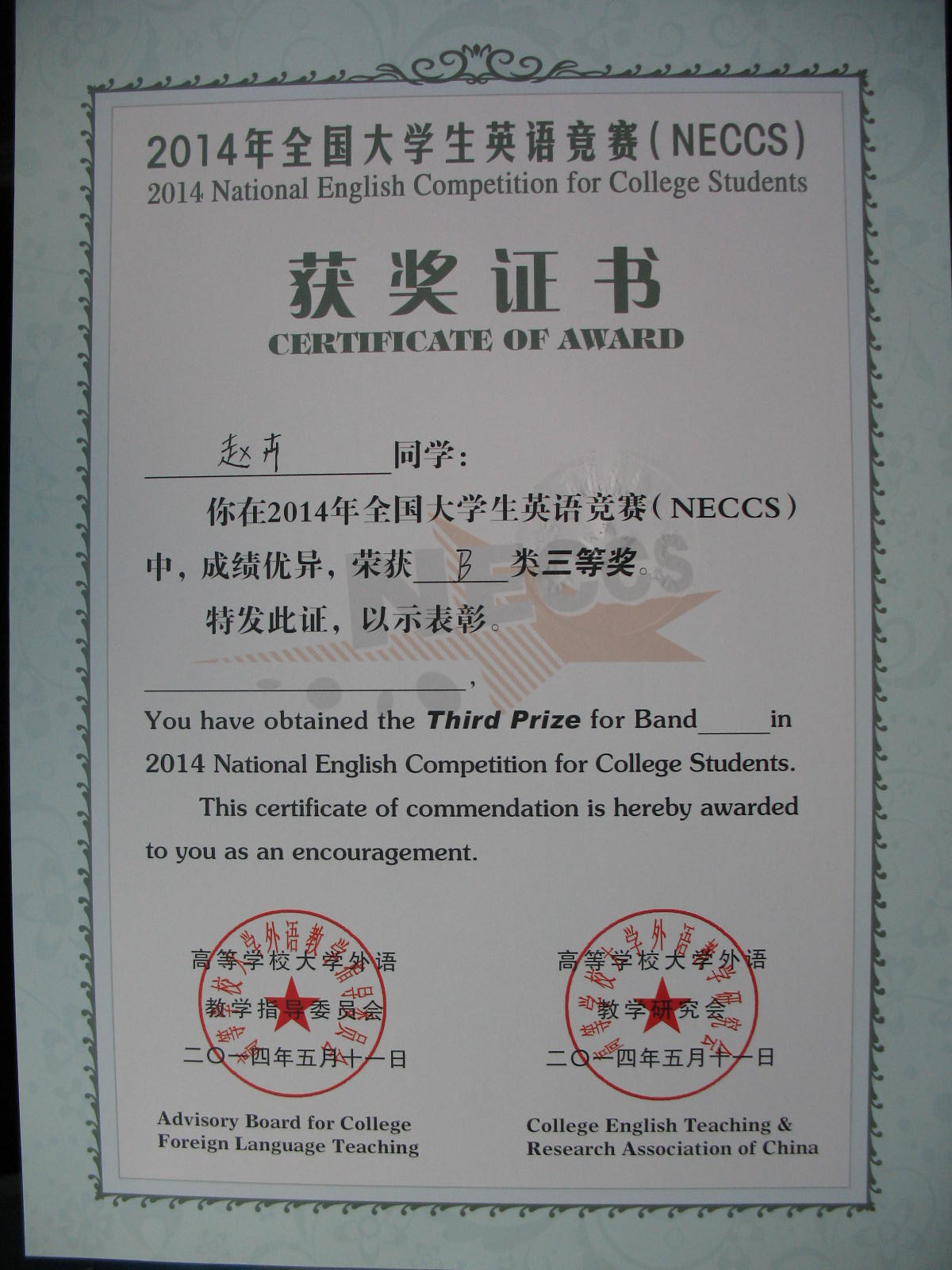 赵卉同学获得“2014年全国大学生英语竞赛B类三等奖”