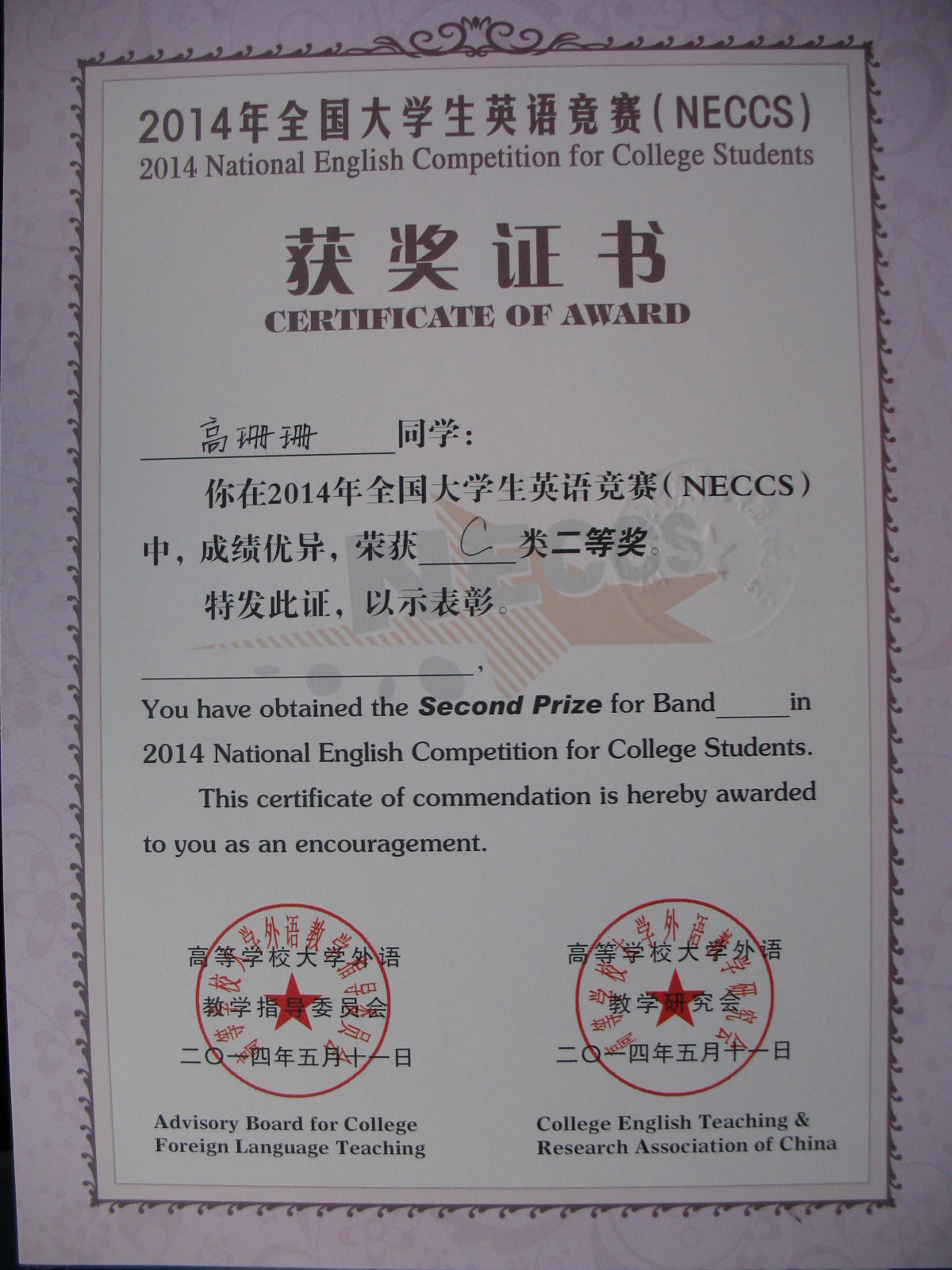 高珊珊同学获得“2014年全国大学生英语竞赛C类二等奖”