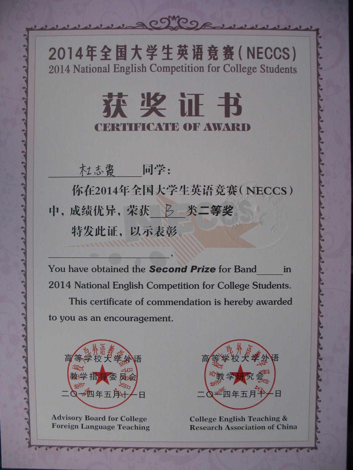杜志霞同学获得“2014年全国大学生英语竞赛B类二等奖”