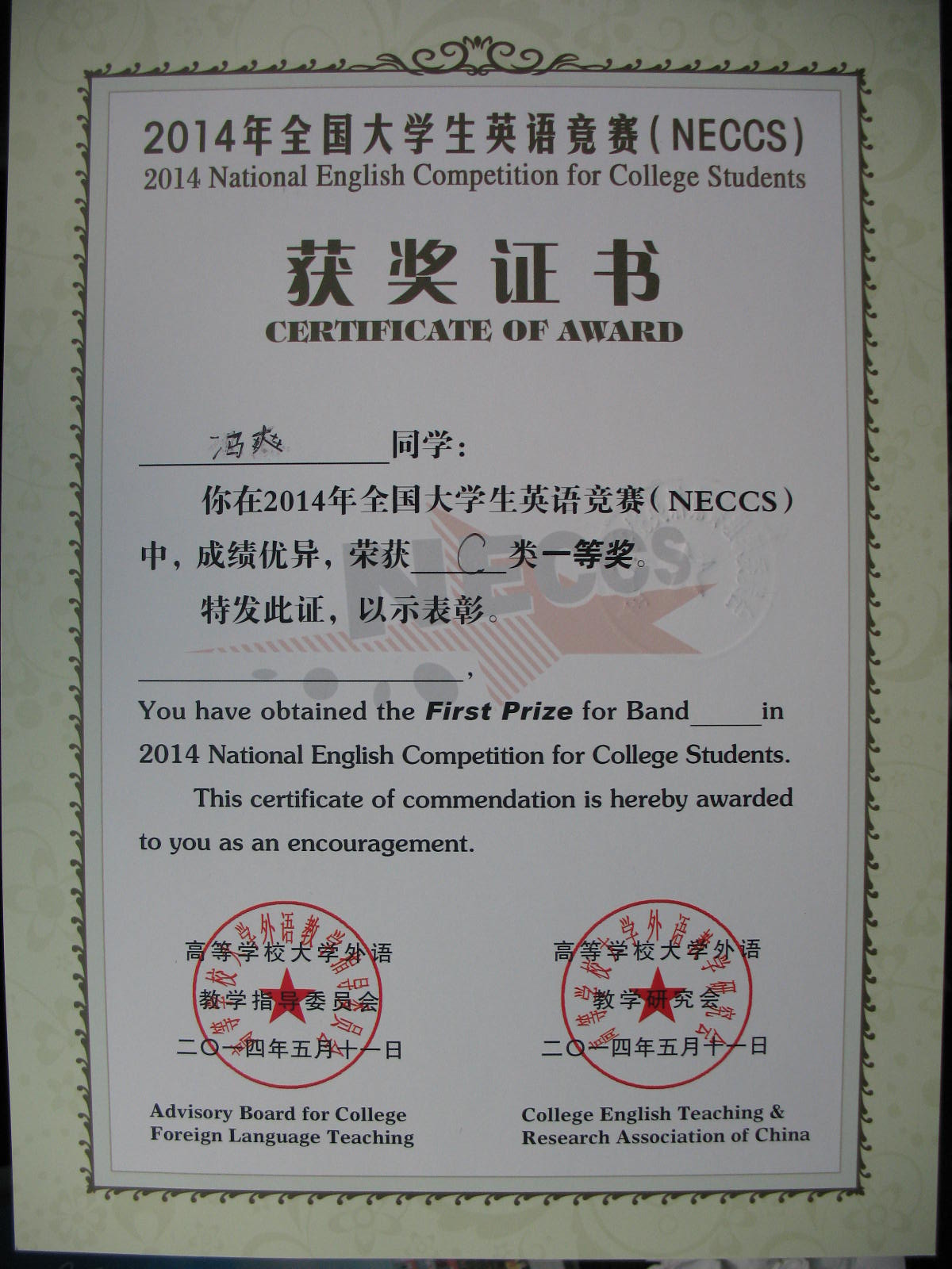 冯爽同学获得“2014年全国大学生英语竞赛C类一等奖”