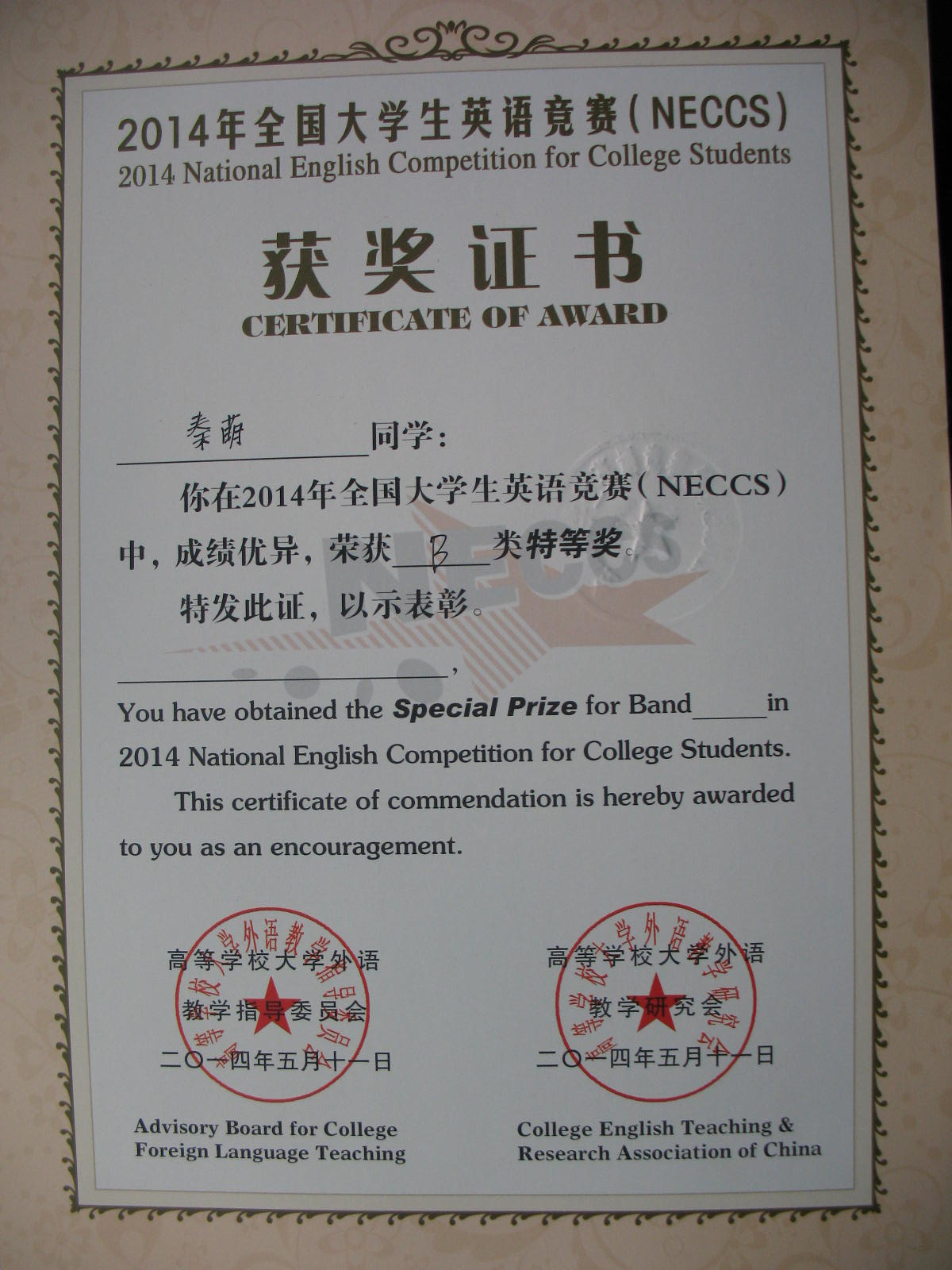 秦萌同学获得“2014年全国大学生英语竞赛B类特等奖”