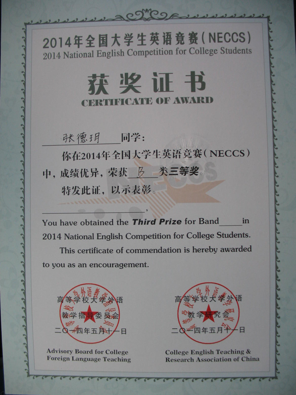 张德玥同学获得“2014年全国大学生英语竞赛B类三等奖”
