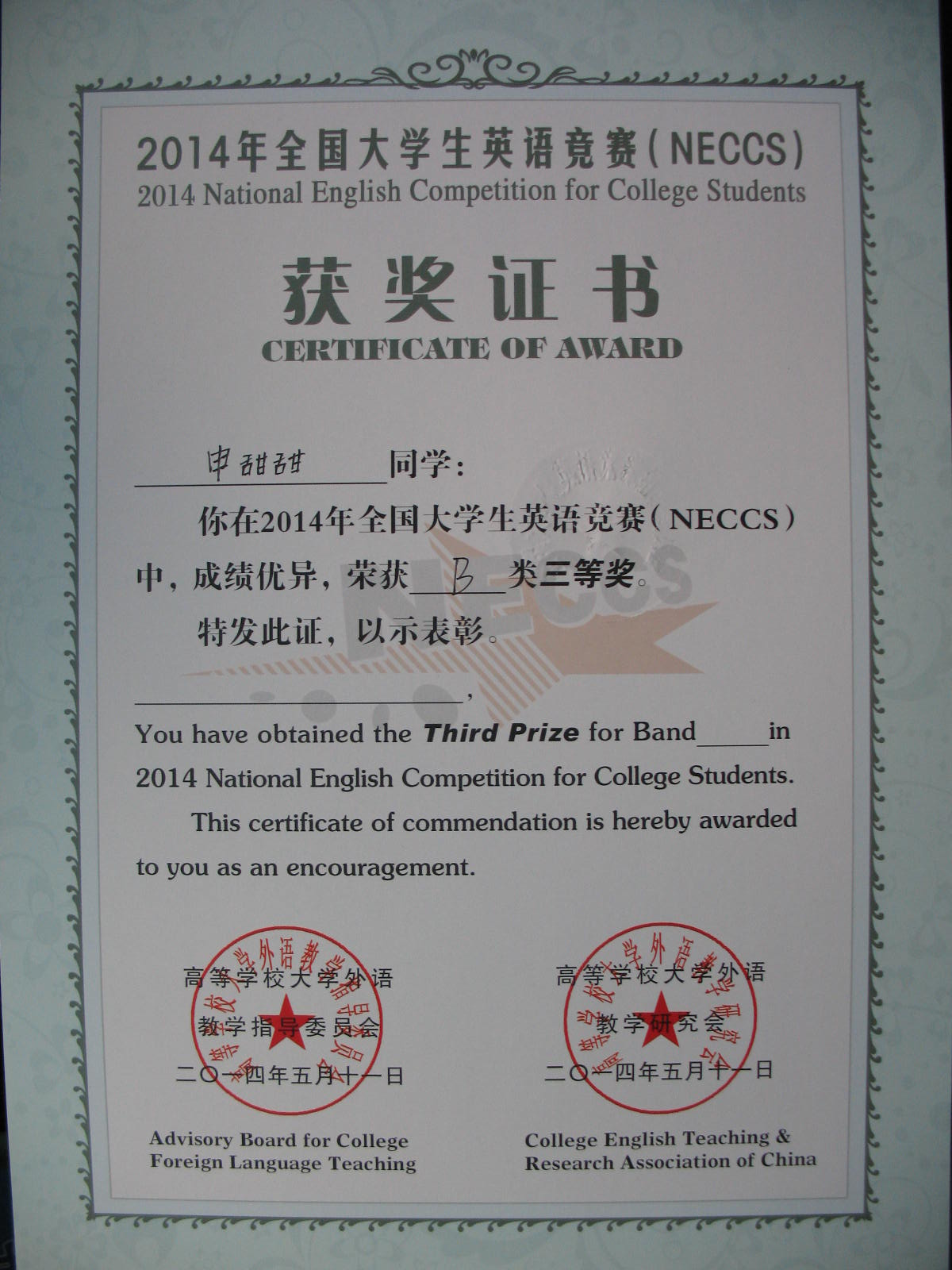 申甜甜同学获得“2014年全国大学生英语竞赛B类三等奖”