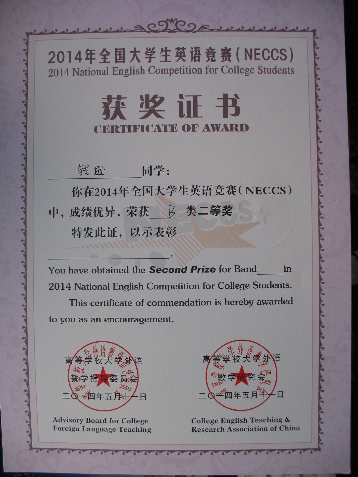 钱逊同学获得“2014年全国大学生英语竞赛B类二等奖”