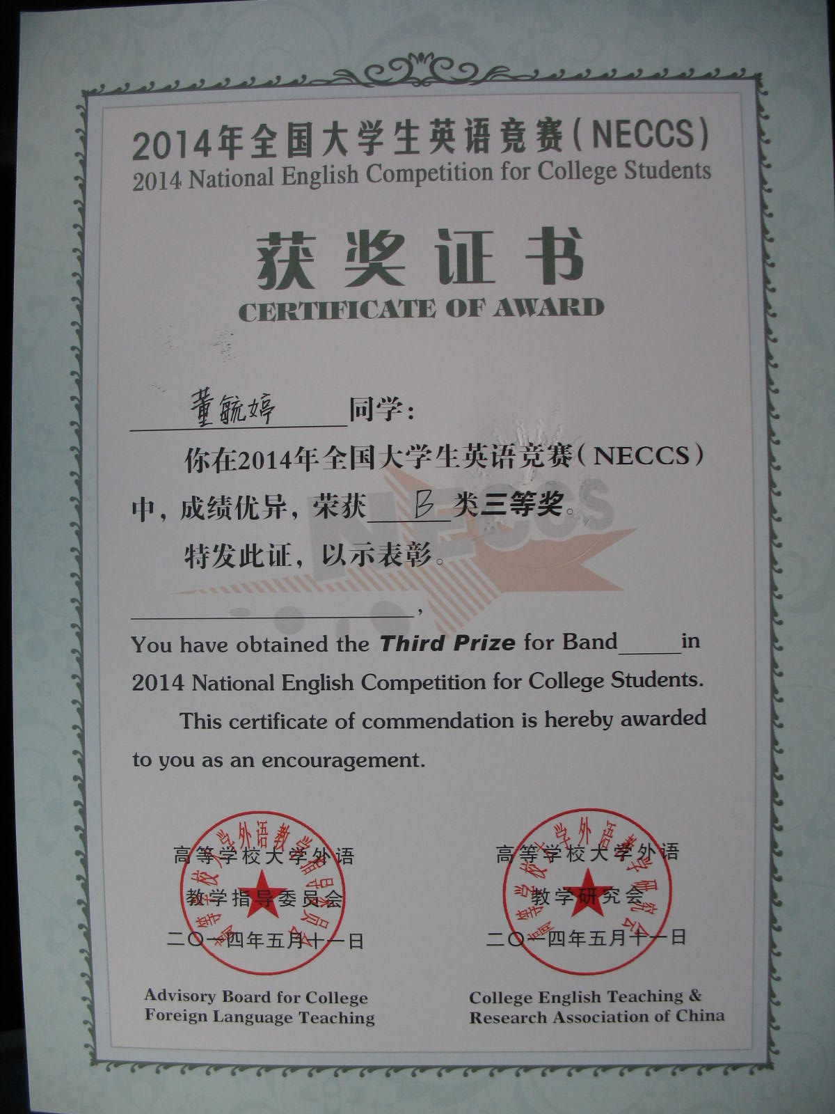 董毓婷同学获得“2014年全国大学生英语竞赛B类三等奖”