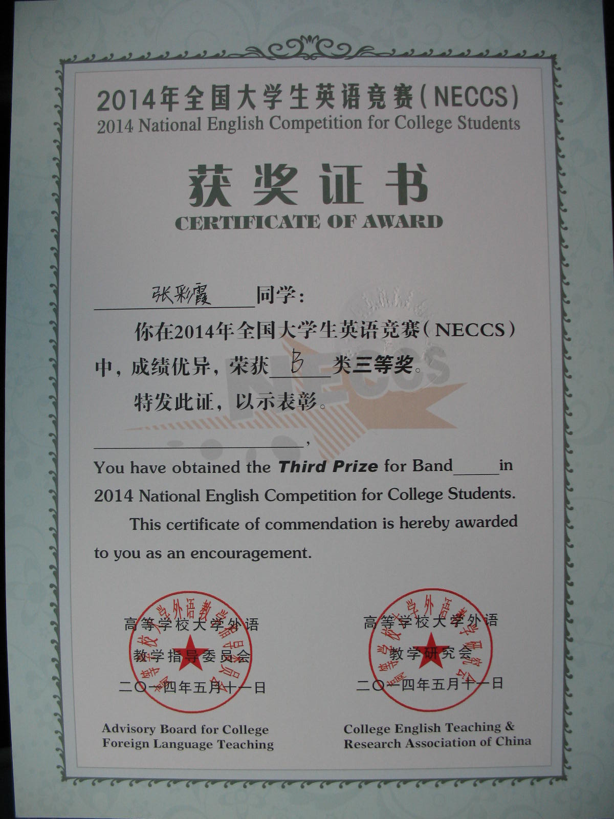 张彩霞同学获得“2014年全国大学生英语竞赛B类三等奖”