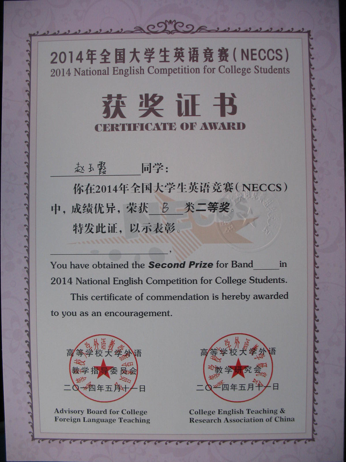 赵玉霞同学获得“2014年全国大学生英语竞赛B类二等奖”