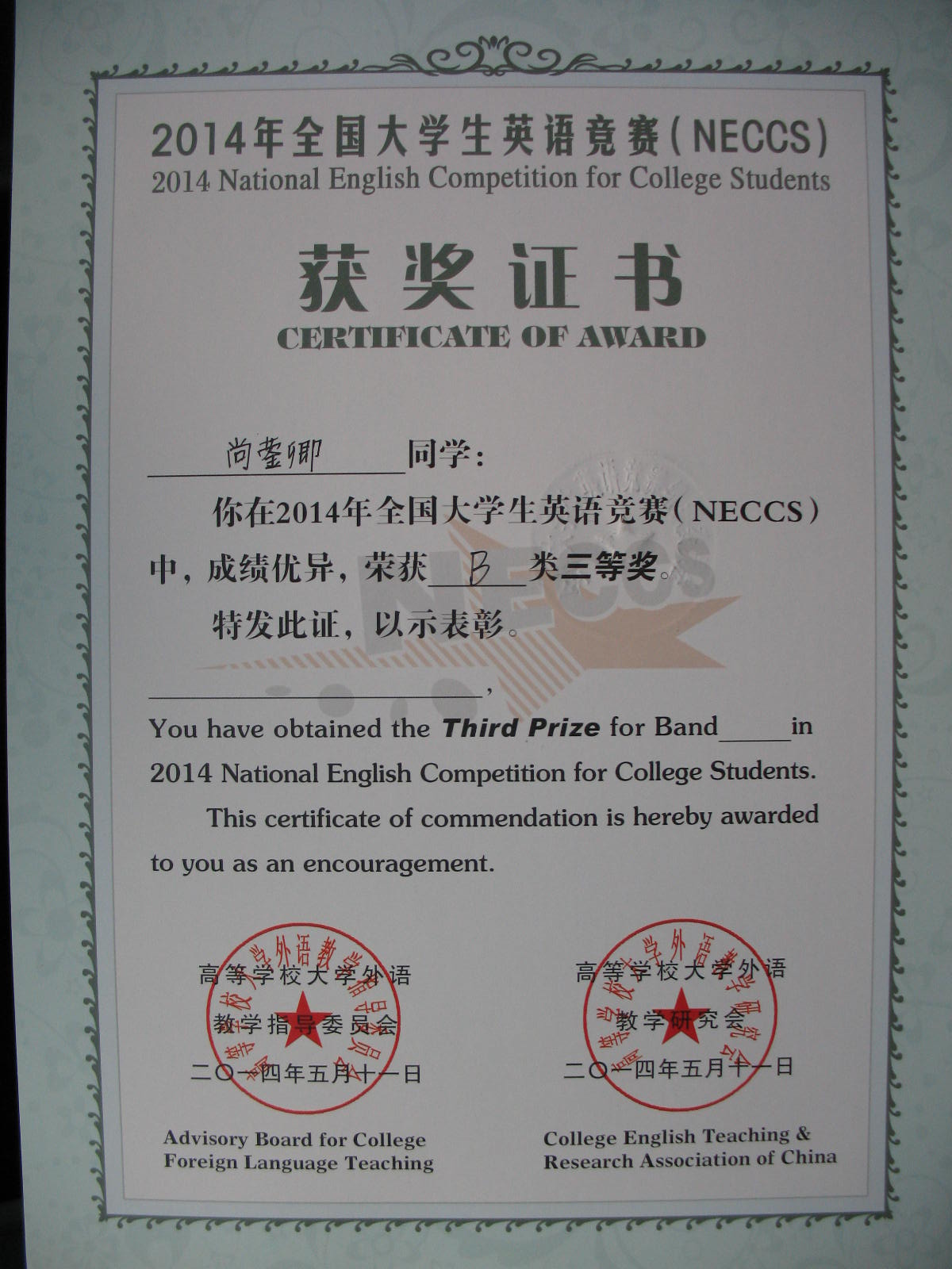 尚莹卿同学获得“2014年全国大学生英语竞赛B类三等奖”