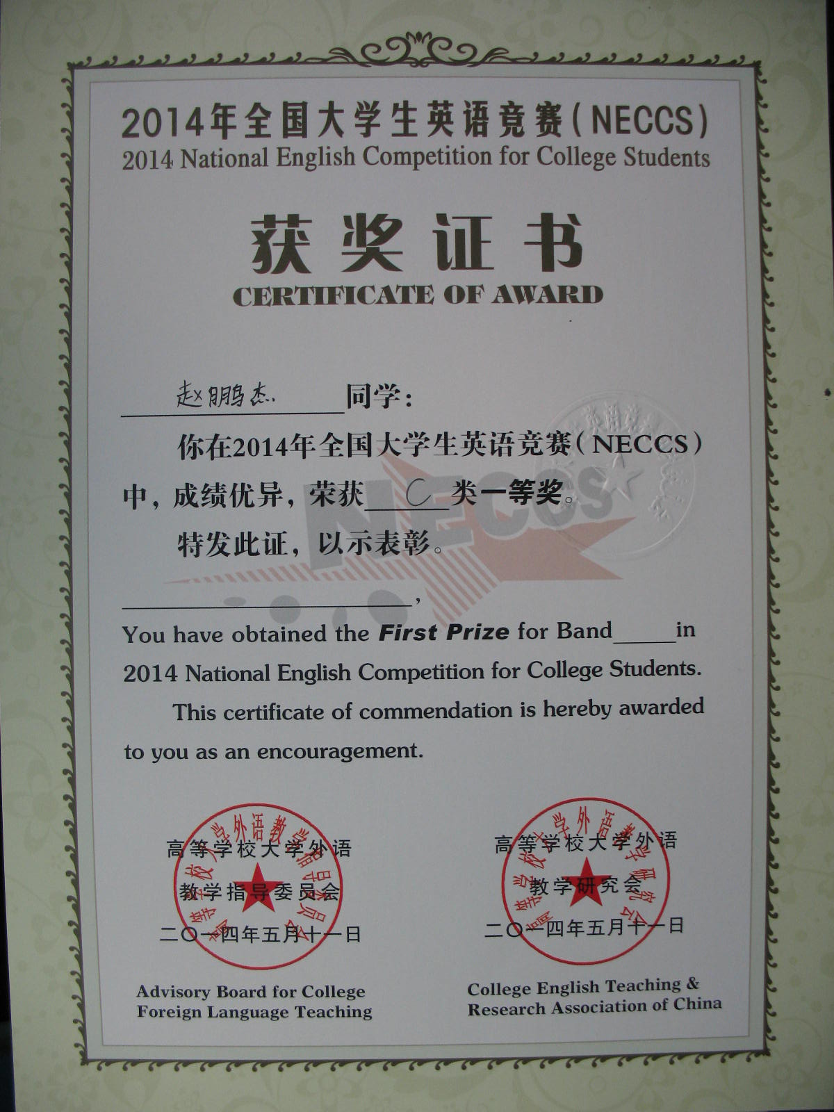 赵鹏杰同学获得“2014年全国大学生英语竞赛C类一等奖”