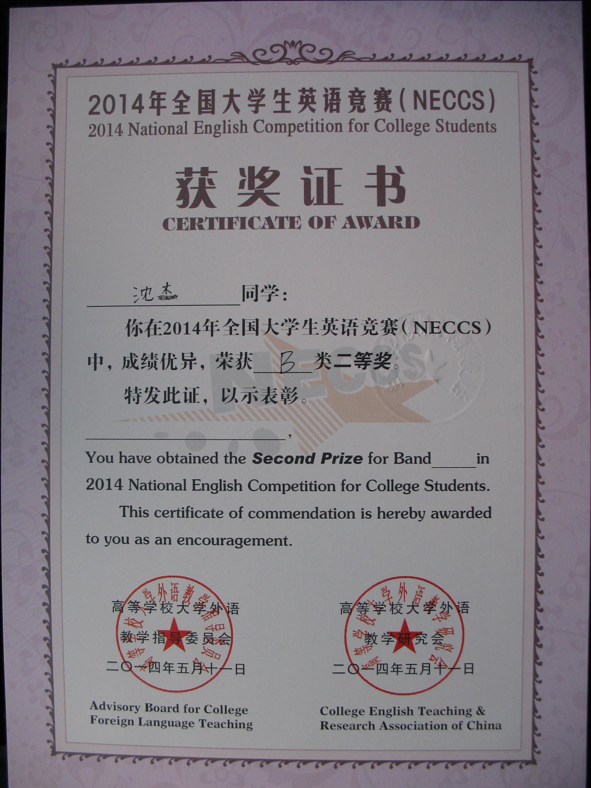 沈杰同学获得“2014年全国大学生英语竞赛B类二等奖”