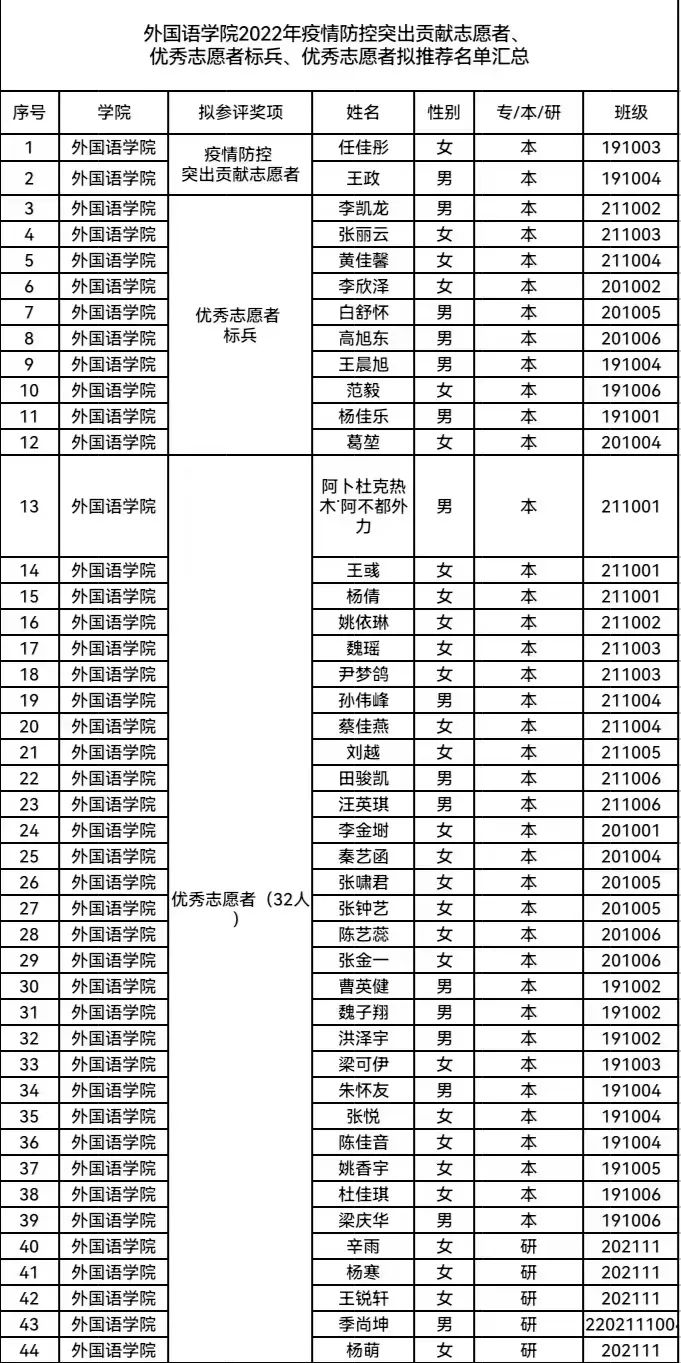 为大力弘扬“奉献、友爱、互助、进步”的志愿精神,鼓励引导全校学生积极参与志愿服务,在急难险重任务中担当作为。我校决定开展2022年疫情防控突出贡献志愿者、优秀志愿标兵、优秀志愿者的公示的评选工作。按照学校团委的志愿者评选标准,日本无码av 拟推荐2位疫情防控突出贡献志愿者、10位优秀志愿标兵、32位优秀志愿者。