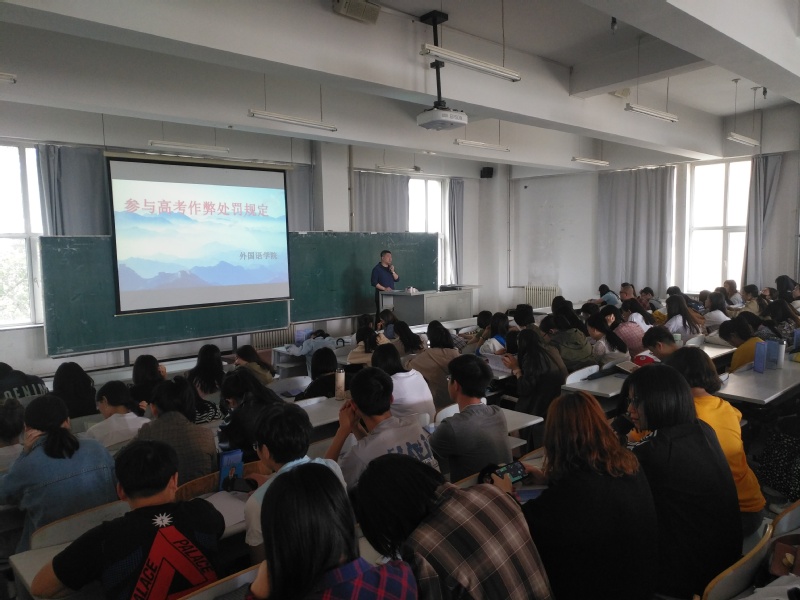 全体学生在团委书记赵海涛老师的指导下,于教图楼401室召开了“关于高考作弊处罚规定”大会。