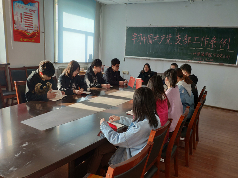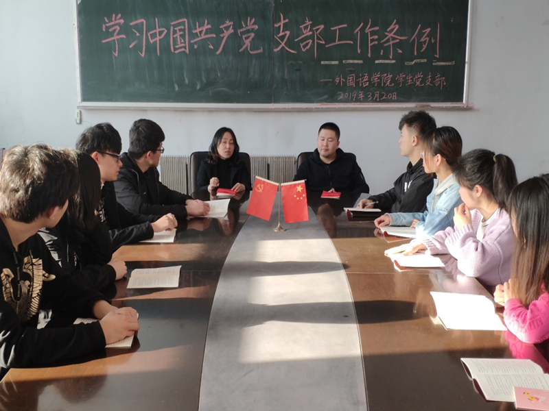党委副书记王颖群、学生党支部书记赵海涛领导学生党支部成员在外语楼会议室召开了支部党员大会,组织学习《中国共产党支部工作条例》。